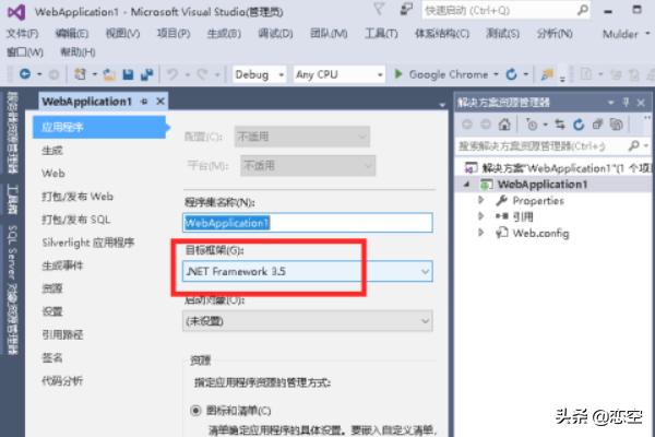 因为我们是创建的空应用程序所有整个目录结构很简单我们可以右键单击我们的 应用程序,选择属性来确认我们当前的框架是否使用的是 ASP.NET 3.5