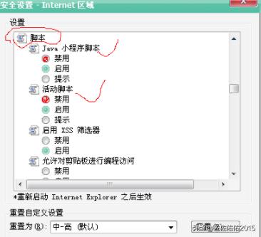 3、在安全设置窗口中我们在设置下面通过滑动条找到脚本选项,在【脚本】下面的【Java小程序脚本】选择“禁用”,在【活动脚本】下面也选择“禁用”然后点击确定完成设置,如下图所示: