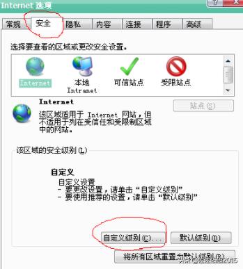 2、打开Internet选项窗口之后选择安全选项卡,在下面点击自定义级别进入安全设置。