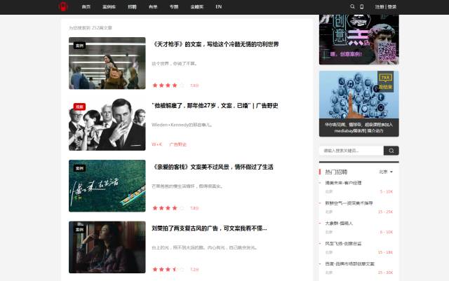 顶尖文案里会有国内外有意思的广告案例,将创意与广告传播相结合,时下的热点文字与文章。页面很简洁,电脑端和手机端都不错。