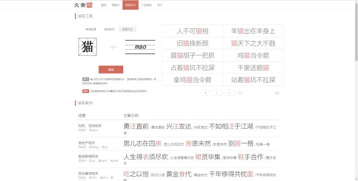 ⑤文案狗 和网站的名字一样,它透着一股傻乎乎的憨劲儿。如果脑中丝毫没有文案的灵感,不妨写下一个关键字,例如“猫”,它会给出带猫字或猫的谐音字相关的成语、俗语,是一个很方便的启发文案灵感的工具,稀奇古怪的谐音即使当下不能让你灵感爆发,也会让你噗嗤一笑。