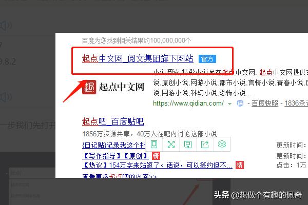 2、搜索以后会出现一个页面,然后第一个就是起点的官网了,找到之后我们点击进入。