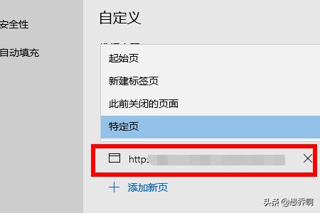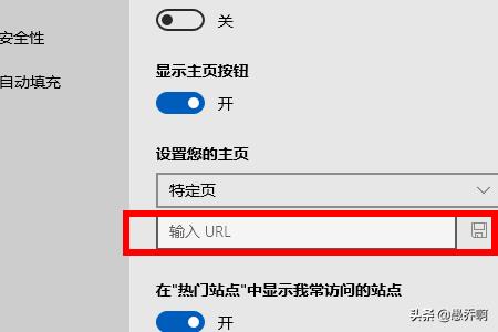 7、向下拖拉滚动条,在设置您的主页下方选择特定页,然后按同样的方法输入需要的网址,点击右侧的保存图标。